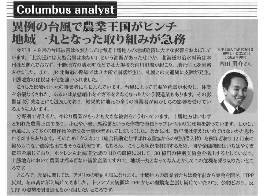 北海道十勝地方の経済状況について聞かれましたので、台風とトランプさんのことを書いています。