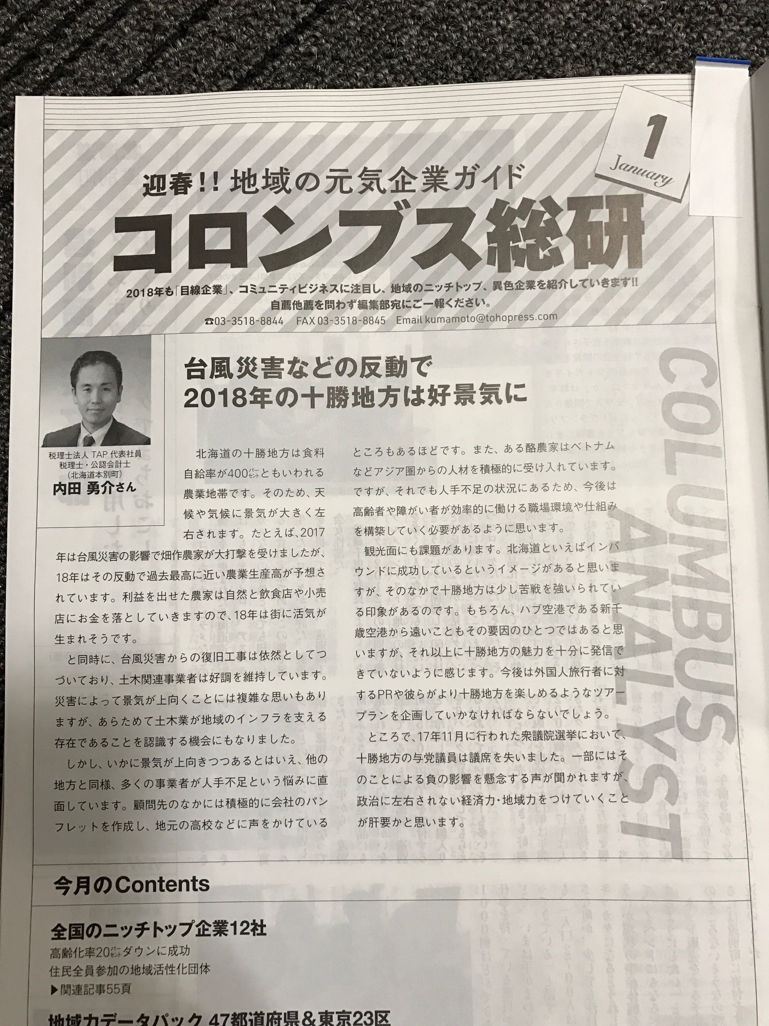 『月刊コロンブス』の新春号にて取材を受けまして記事が載りました。