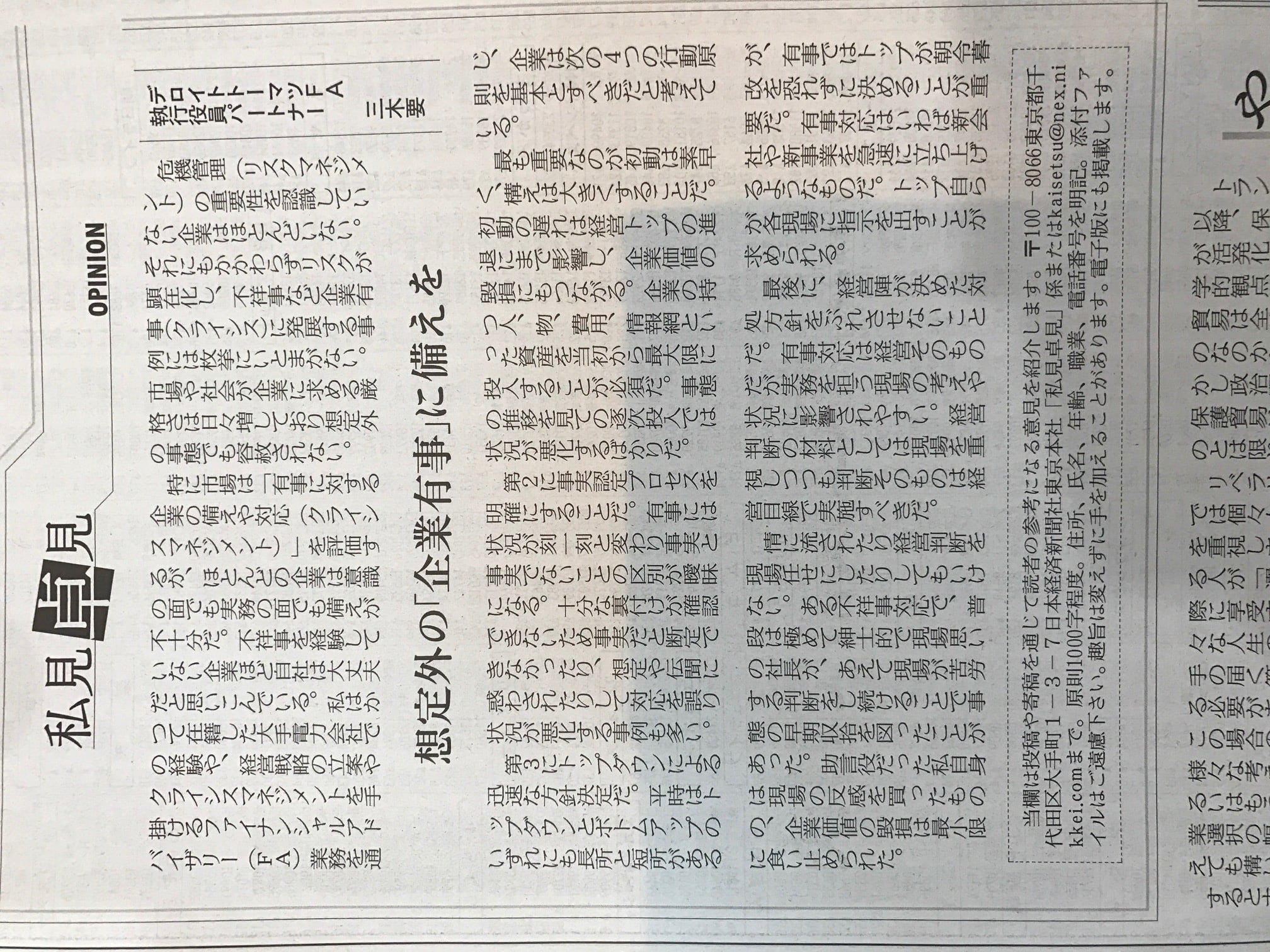 日経新聞でリスクマネジメント(危機管理)の記事が載っていて目を引きました。