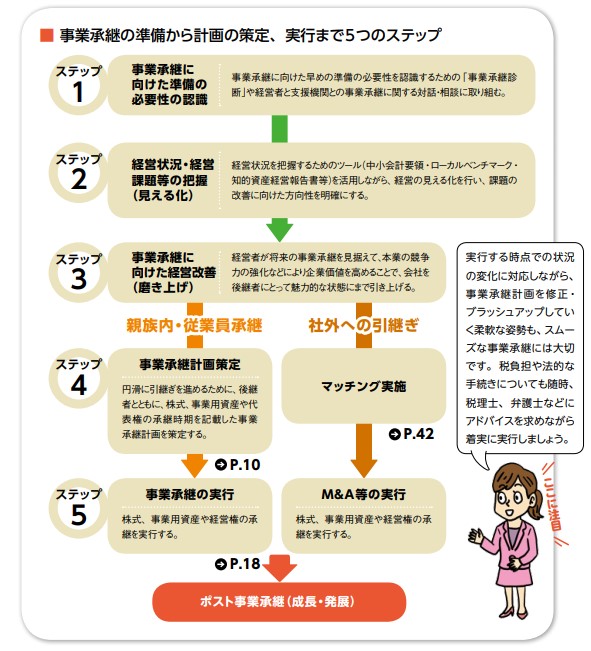 こちらは中小企業庁のHPにある事業承継マニュアルから転用した「事業承継の5つのステップ」ですが、