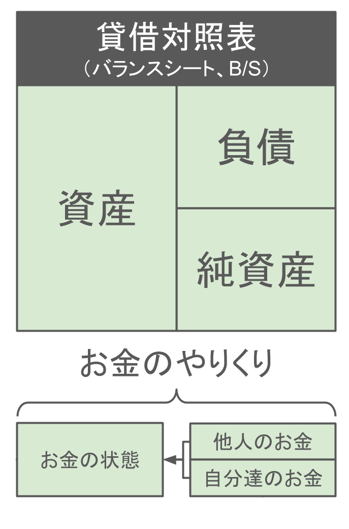 貸借対照表はB/S(BalanceSheetバランスシート)と呼ばれるように、右と左がバランスが取れた、事業者がその時どれだけの資産負債を持っているかを示す、とても大切な表です。