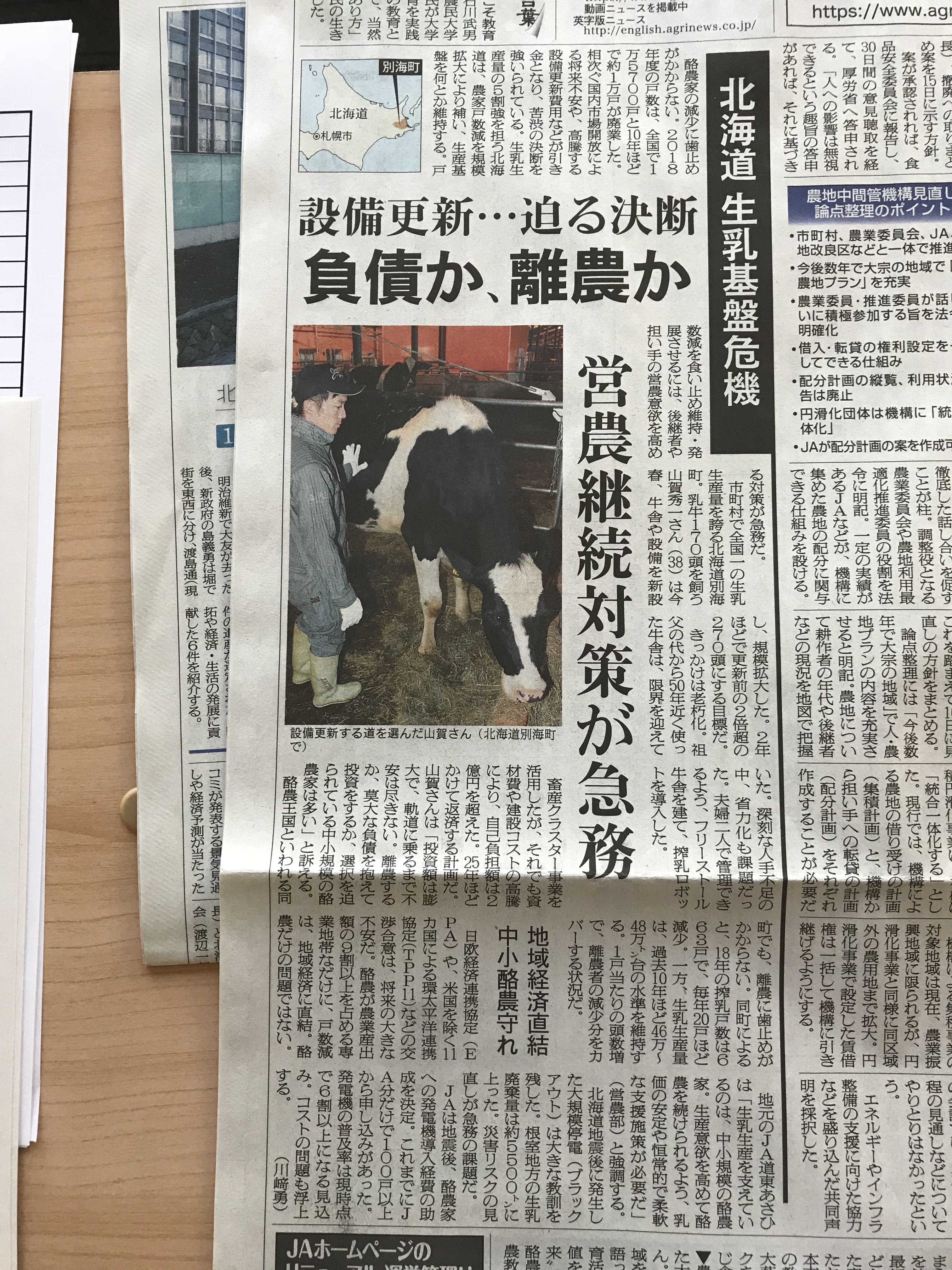 先日、日本農業新聞の「北海道 生乳基盤危機」という記事を読みました。